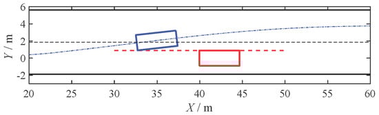 At the start of the lane change, the velocity of the car in front of the target lane is larger than that of the car in question and the initial longitudinal distance is sufficient; if the car in front keeps its current driving state and there is no collision risk with the car, the safety factor of lane change is UL = 3 and the time of lane change is tL = 5.31 s. Within 1.5 s from the start of the lane change, the vehicle follows the original planning trajectory. After 1.5 s, the longitudinal distance between the two vehicles decreases sharply due to the braking of the vehicle in front of the target lane. If the car still tracks the original planning trajectory, a rear-end collision will occur at 4.22 s, as shown in Figure 13.