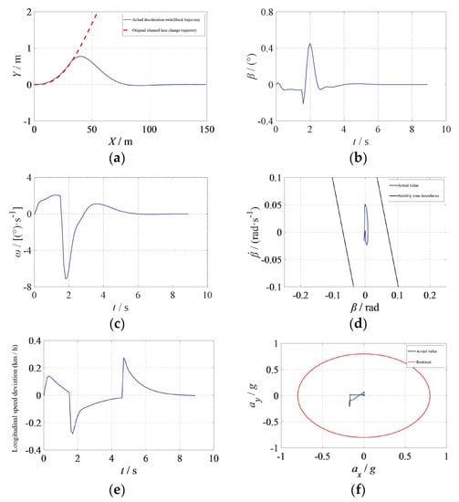 As can be seen from Figure 15a, within 1.5 s of the start of the lane change, the vehicle tracks the original planned trajectory. When the lane change is at 1.5 s, trigger the lane-change replanning and perform the lane-change trajectory switchback. It can be seen from Figure 15e that under the deceleration switchback conditions, the deviation between the longitudinal speed of the vehicle and the reference speed is small, and the maximum deviation is 0.28 km/h. As can be seen from Figure 15b–d,f, during the lane-change switchback, the amplitude and fluctuation of the declination angle of the center of mass of the vehicle are small, the amplitude of the vehicle yaw angle speed is small, and the vehicle driving state is always located in the phase plane stability zone. The vehicle conforms to the friction circle constraint. From the start of the lane change to the end of the lane switchback, the vehicle has not crossed the collision risk auxiliary line that coincides with the right side of the vehicle in front of the target lane, so the vehicle and the vehicle in front of the target lane will not collide. From the beginning of the lane change to the end of the switchback, the longitudinal distance between the car and the vehicle in front of the original lane is always greater than zero, and there will be no collision with the vehicle in front of the original lane. The simulation verified that the deceleration switchback strategy can meet the driving safety and stability of the vehicle at the same time.