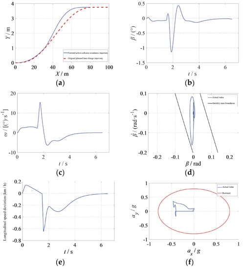 As can be seen from Figure 16a,e, the vehicle begins to perform forward active collision avoidance 1.5 s after the start of lane change, increases the steering angle to merge into the target lane as soon as possible, and brakes to decelerate. It can be seen from Figure 16b–d,f that the longitudinal and lateral acceleration of the vehicle is large, but it still meets the friction circle constraint. The declination angle and yaw angle velocity of the center of mass cause large fluctuations due to emergency obstacle avoidance, but the driving state of the vehicle is always in the phase plane stability zone. Stable driving is achieved throughout. The simulation verified that under the conditions that the vehicle in front of the original lane and the target lane are braking at the same time, forward active collision avoidance can avoid collision and effectively ensure the driving stability of the vehicle.