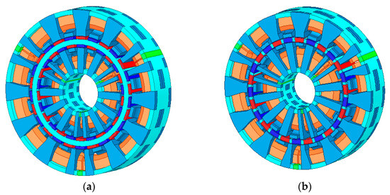 Figure 2 shows the structural diagrams of a concentric double-stator PMCPM with two rotor structures. Figure 2a shows a concentric double-stator PMCPM with a double-layer permanent magnet rotor structure (PMCPM1), and Figure 2b shows a concentric double-stator PMCPM with a single-layer permanent magnet rotor structure (PMCPM2). PMCPM1 and PMCPM2 are composed of three parts: the outer stator, the middle rotor, and the inner stator. The outer stator structure is the same as the single-stator and single-rotor structure.