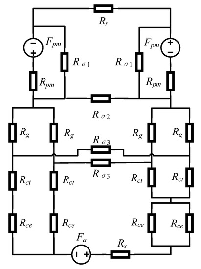 Based on the main magnetic flux path and operating principle of the double-stator claw pole motor shown in Figure 3 and Figure 4, PMCPM1 can construct an equivalent magnetic circuit model, as shown in Figure 6. The paths of the inner and outer magnetic circuits are the same, so the topology of the equivalent magnetic circuit model on the inner and outer sides is the same, but the magnetic resistance is different.