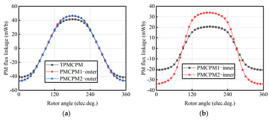 Comparison of no-load permanent magnet flux linkage. (a) Outer stator winding; (b) inner stator winding.