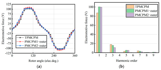 Figure 10 shows the no-load electromotive force of the outer stator winding of three PMCPMs. The no-load electromotive force amplitude of TPMCPM is 102.2 V, and the no-load electromotive force amplitude of PMCPM1 and PMCPM2 is 109.0 V and 104.7 V. The electromotive force of three motors is similar. However, it can be seen from Figure 10b that the no-load electromotive force fundamental amplitude of TPMCPM is 87.1 V, and the no-load electromotive force fundamental amplitude of PMCPM1 and PMCPM2 is 100.4 V and 99.7 V, which is 15.3% and 14.5% higher than TPMCPM. The third and seventh harmonics of the no-load electromotive force of PMCPM1 and PMCPM2 are significantly reduced, the total harmonic distortion (THD) of the no-load electromotive force of TPMCPM is 21.7%, and the THDs of the no-load electromotive force of PMCPM1 and PMCPM2 are 17.0% and 12.6%, respectively. The double-stator structure significantly reduces the harmonic content of electromotive force. Figure 11 shows the comparison of the no-load electromotive force of the inner stator of two double-stator PMCPMs. The no-load electromotive force amplitude of the inner stator winding is 70.4 V and 120.7 V, and the no-load electromotive force THDs are 43.5% and 46.1%, respectively. Because the thickness of the rotor of PMCPM2 is thin, the inner rotor structure can be designed to be larger, so the winding electromotive force of the inner stator is larger. Due to the high harmonic content of the no-load electromotive force in the inner stator winding of the two motors, the double-stator structure may have a large cogging torque and torque ripple.