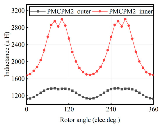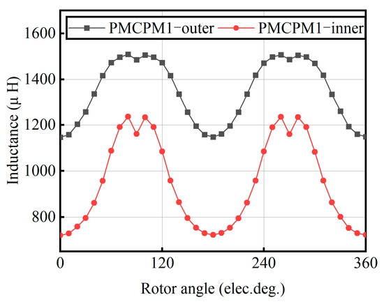 Figure 12 shows the self-inductance of the inner and outer windings of a PMCPM1 structure double-stator claw pole motor. It can be seen that the average self-inductance of the outer winding is 1334 μ H. The average self-inductance of the inner winding is 887 μ H. The average self-inductance of the outer winding is greater than that of the inner winding because the magnetic circuits between the inner and outer windings of PMCPM1 are not coupled. The outer permanent magnet of the outer winding and rotor can be regarded as an inner rotor claw pole motor, and the inner permanent magnet of the inner winding and rotor can be regarded as an outer rotor claw pole motor. Due to the short magnetic circuit and fewer permanent magnets in the external rotor claw pole motor, the self-inductance is low.