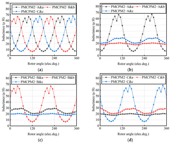 The self-inductance of TPMCPM is 83.3 μ H. The self-inductance of PMCPM1 and PMCPM2 is far greater than that of TPMCPM, which is conducive to sensorless vector control and the direct torque control of motors. The inner and outer windings of PMCPM2 are interconnected, resulting in significant mutual inductance between the inner and outer windings. The mutual inductance between the windings corresponding to the inner and outer sides is the maximum, that is, the mutual inductance between A and a, B and b, and C and c. In Figure 14a, the mutual inductance of these three sets of corresponding windings is shown. Figure 14b–d show the mutual inductance between the outer A, B, and C windings and the inner three-phase winding. It can be seen that the mutual inductance between phase A and a is 32.8 μ H. The mutual inductance between A and b is 19.4 μ H. The mutual inductance between A and c is 24.6 μ H. The inductance between the three-phase windings of the inner and outer windings is shown in Table 2.