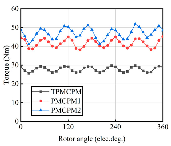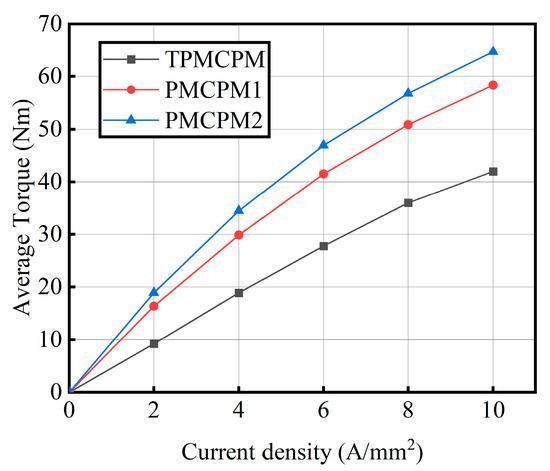 Figure 16 shows the average torque of three types of PMCPMs under different current densities, and Figure 17 shows the torque waveforms of three types of PMCPMs under 6 A/mm2 operating conditions. It can be seen that the torque of the two types of double-stator structure motors is significantly higher than that of TPMCPM. At 6 A/mm2, the average torque of TPMCPM was 27.8 Nm, and the average torques of PMCPM1 and PMCPM2 were 41.5 Nm and 46.9 Nm, respectively, which increased by 49.3% and 68.7% compared to TPMCPM. However, under the working condition of 6 A/mm2, the torque ripple of TPMCPM is 14.8%, and the torque ripples of PMCPM1 and PMCPM2 are 16.9% and 22.7%, respectively. The torque ripple increased by 14.2% and 53.4% compared to TPMCPM. As the current density increases, the slope of the change in the torque gradually decreases, which is caused by the large leakage of the stator core of the PMCPM. As shown in Figure 16, the slopes of PMCPM1 and PMCPM2 at different positions are greater than those of TPMCPM, indicating that the overall magnetic leakage of the double-stator motor is smaller than that of TPMCPM.