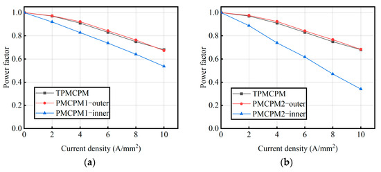 Power factor comparison of two double-stator claw pole motors. (a) PMCPM1; (b) PMCPM2.