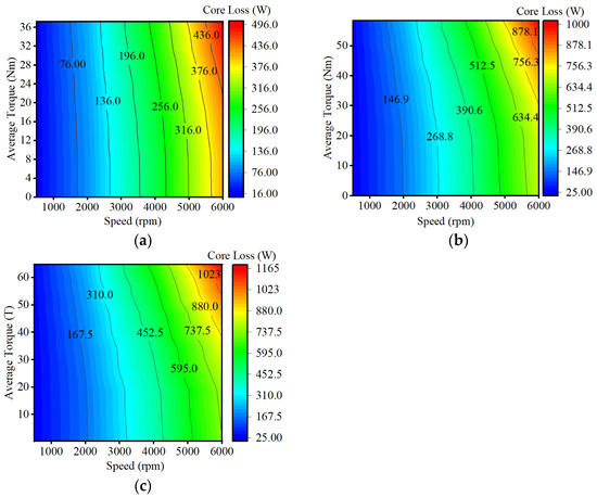 The iron loss of TPMCPM, PMCPM1, and PMCPM2 is a function of speed and torque. In Figure 19, as the speed increases, the iron loss gradually increases. When the speed is 1500 rpm and the current density is 6 A/mm2, the iron losses of TPMCPM, PMCPM1, and PMCPM2 are 69.6 W, 126.7 W, and 144.1 W, respectively. Due to the addition of an inner stator in the double-stator structure, the inner stator significantly increases the motor’s iron loss. The inner space of PMCPM2 is larger, and the inner stator is much larger than PMCPM1, resulting in a 13.7% increase in motor iron loss compared to PMCPM2.