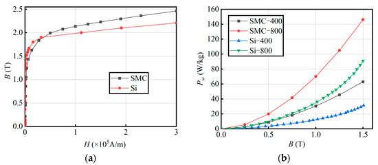 BH curve and loss curve of silicon steel and SMC materials. (a) BH curves of two materials; (b) loss curves of two materials.