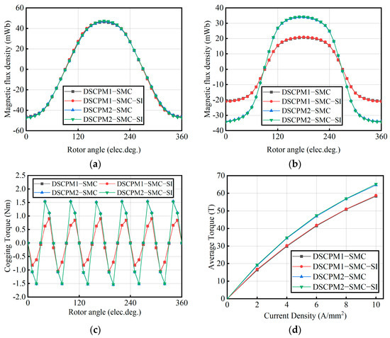 Performance comparison and analysis of hybrid material magnetic core structure motors. (a) Comparison of magnetic flux linkage of outer stator winding; (b) comparison of inner stator winding flux linkage; (c) cogging torque; (d) torque at different current densities.