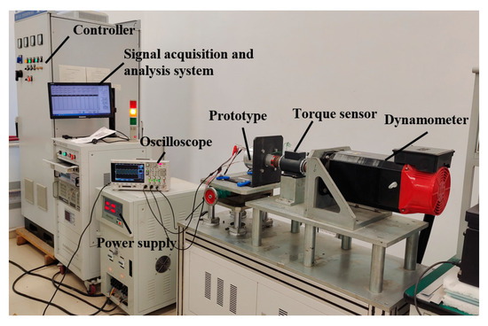 The performance of the prototype was tested by using the experimental platform shown in Figure 26. The experimental platform includes a dynamometer system, the signal acquisition system, a torque sensor, an oscilloscope, and a liftable prototype stand. The dynamometer system can output constant speed, the torque sensor has a range of 0–50 Nm, and the four-channel oscilloscope can display three-phase waveforms simultaneously. The signal acquisition system can collect the data output from the speed sensor, torque sensor, and oscilloscope for analysis and processing.