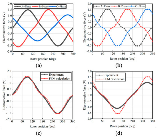 Comparison of experimental and test results. (a) Measured three-phase EMF; (b) calculated three-phase EMF; (c) comparison of calculated and tested of A-phase EMF; (d) comparison of calculated and tested of C-phase of C-phase EMF.