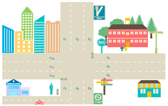 Junctions come in a variety of shapes and sizes. We want to concentrate on the often-seen four-way junction, also known as a crossroad, as shown in an intersection environment in Figure 1. However, the recommended method may easily be applied to several junctions with various layouts. An average intersection has twelve incoming lanes. The ID for each lane is numbered clockwise from the top and is unique. Since each lane only travels in one direction, this crossing is straightforward.