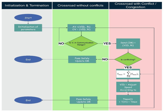 Vehicle “i” adjusts its acceleration in response to Tmax(i) using information received from the IM unit. When a feedback signal is larger than zero and tmax has elapsed, vehicle “i” must ensure that the intersection is reached. It is important to emphasize that autonomous vehicles may adjust their speed in several ways. The car must proceed through the crossing as quickly as possible but no later than Tmax. You should also consider a safe length of time. The vehicle then sends the expected time of intersection departure through the IM component Tmax(i). The IM unit modifies the variables I route “i” and Tmax in the data list (i). Any vehicle leaving the junction must tell the impedance monitoring unit beforehand if they want their name eliminated from the list. As a consequence, the procedure will be repeated [29].
