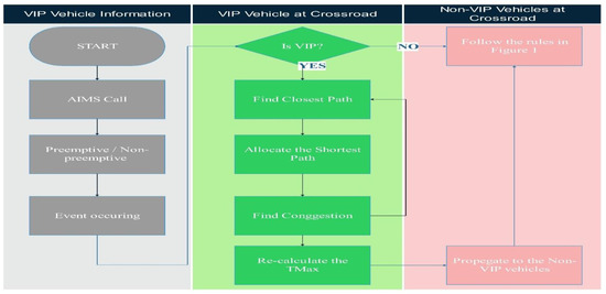 Regardless of whether it is autonomous or not, the AIMS evaluates the vehicle to decide if it is an OV or a VIP car. If it is a typical vehicle, the non-preemptive timeline is used. The preemptive schedule is activated if the vehicle is designated as the VIP car. The quickest route must be found and recommended to AIMS by the IM. The shortest path should consider both time and distance. The IM will alert AIMS once it has discovered the quickest route and update the Tmax list to modify the plan for all other cars. At the completion, the route for all autonomous cars will be changed.