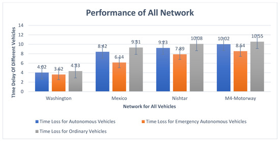 The performance of various networks is shown in Figure 5 in terms of time wasted. The rate of delay of all vehicles and the resulting change in speed is used to evaluate the effectiveness of the junction management system. Due to variations in T1 and T2 in real time, the delay duration varies depending on the trajectory type and even from vehicle to vehicle.