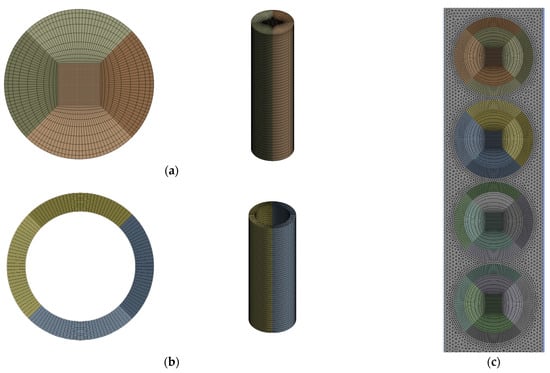 Mesh distribution across the battery and fluid domains: (a) battery grid, (b) PCM module grid, (c) BTMS grid.