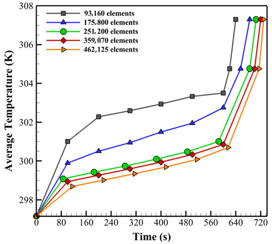 A grid independence test is necessary for CFD simulations to ensure that the mesh size does not affect the results. A mesh discretizes the physical domain into a finite number of cells. The smaller the mesh size, the more accurate the simulation results will be. However, a smaller mesh size also means a higher computational cost. Therefore, adopting a mesh size that is small enough to achieve accurate results without being too computationally expensive is essential. The geometry and mesh were created using the ANSYS Workbench 2020 software environment. The grid distribution of the computing domain and the module components is shown in Figure 2. It can be observed that hexa and prism elements are applied to the domain for the current study. A transient model was used to simulate the BTMS due to unsteady heat generation. The turbulent flow was assumed for a Reynolds number greater than 3000, and a 3D battery module was simulated under the k-ε turbulence model in this paper. The battery module was exposed to an ambient temperature of 297.65 K at 5C. A constant velocity of 2 m/s provided air cooling. The simulation was performed with a time step of 0.1 s and 25 iterations per time step, with convergence residuals of 10−6, 10−6, and 10−9 for the continuity, velocity, and energy equations, respectively. The results of a mesh independence study for the average battery temperature distribution are shown in Figure 3. Meshes with varying numbers of elements, i.e., 93, 160, 175, 800, 251, 200, 359, 070, and 462,125, were selected for comparison. The differences between the average temperature values at the designated point is obtained when the mesh elements number was 251,200(less than 1%). Therefore, it was decided that the optimum mesh element number was 251,200, which was sufficient to achieve the desired accuracy while saving computational time. Consequently, this study selected an optimal mesh size for all cases.