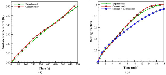 (a) Surface temperature comparison between the numerical and the experimental results of Lai et al. [40]. (b) Melting fraction comparison between the numerical and the experimental results of Shmueli et al. [38].