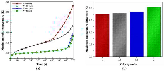 This section investigates the efficiency of the proposed BTMS by varying the fan speed under a 5C discharge rate and an inlet air temperature of 24.5 °C. Based on this assumption, the inlet velocities are presented in Table 5 in terms of Reynolds number. The flow regime type is determined based on the Reynolds number. Figure 5a displays the behavior of maximum temperature over time and the comparison of temperature uniformity of the module under different air velocities. When the velocity of the inlet increases, the maximum temperature of the discharge process gradually decreases, which is clearly evident after the first 20 s. However, in terms of temperature difference, increasing velocity gradually increases the battery’s temperature uniformity (Figure 5b). In the initial stages of discharge, the inlet air velocity has a negligible effect on reducing the temperature rise due to the paraffin melting before this stage. Thus, the inlet velocity increases, decreasing the battery’s temperature, and increasing the uniform temperature distribution. For inlet velocities of 2, 1, 0.5, and 0 m/s, the maximum temperatures were obtained as 308 K, 310.12 K, 313.47 K, and 323.20 K, respectively. Therefore, the average Reynolds number of 5613.6, which corresponds to 2 m/s inlet velocity, was selected for further analysis.