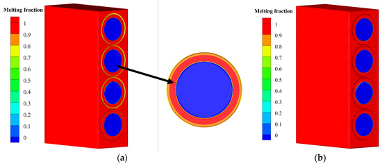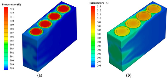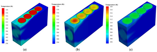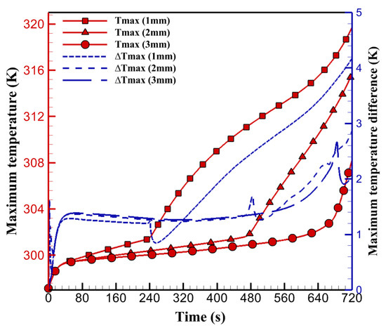 Analysis of PCM at different thicknesses was performed to determine the optimal efficiency of the battery module. As a result, selecting the desired thickness could enhance the battery’s thermal performance. The battery pack had a composite paraffin/aluminum PCM with 4.49 W/m·K thermal conductivity and an initial thickness of 1 mm. To better demonstrate the thermal efficiency, the thickness of the PCM was adjusted to 1, 2, and 3 mm, while other parameters remained unchanged. The maximum temperature and temperature difference in the battery pack at the 5C discharge rate were compared (Figure 6). For a thickness of 1 mm, the maximum temperature and temperature difference were 319.70 K and 4.17 K, respectively. With an increase in thickness from 1 mm to 2 mm, the maximum values decreased to 315.69 K and 2.86 K, respectively. Following the heat transfer theory, increasing the thickness increases the thermal resistance. With the continued increase in thickness, the effects on the temperature uniformity and maximum temperature decreased to 0.2 and 308 K, respectively, from a thickness of 2 mm to 3 mm. Finally, when the PCM completely melts, its heat transfer capacity is reduced because of its low liquid thermal conductivity. Therefore, adopting the appropriate thickness can lead to a significant improvement in energy efficiency and cost savings.