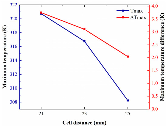 Temperature distributions are shown in Figure 7 for different cell spacings. It is obvious that the temperature decreases with an increase distance. Battery module thermal performance with a cell spacing of 21 mm is very poor, and the temperature quickly increases. The temperature growth with a cell spacing of 25 mm is slower than with 23 mm, indicating an improvement in the system’s thermal performance with an increase in cell distance. Regarding temperature uniformity, as shown in Figure 8, the cell with a 21 mm distance has the highest temperature rate and highest temperature difference at different cell distances. The cell with a 25 mm spacing has the lowest temperature difference, providing better temperature distribution than the other distances. The temperature difference between these two distances decreases by 2.04 °C when the spacing increases from 23 mm to 25 mm, which is attributed to the fast discharge rate.