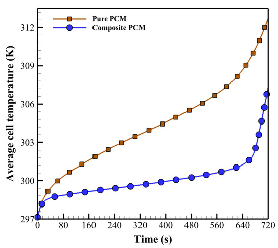 Considering paraffin’s low thermal conductivity, the thermal management efficiency of the battery pack using paraffin and paraffin/aluminum composites under various conditions has been evaluated. Table 3 presents the thermophysical characteristics of the composite and paraffin. To discuss the effect of metallic foam, the average temperature of paraffin and paraffin/aluminum composites is compared as a first step. A moderate temperature profile of the battery pack is shown in Figure 9 under conditions that end at 720 s under the 5C discharge rate. At the end of the discharge process, observations indicate that the cooling achieved by the composite is less than that of paraffin. The average temperature for paraffin and composite was 312.70 K and 307.32 K, respectively. Regarding paraffin cooling, from 20 to 650 s, the temperature growth increases much faster than with the paraffin/aluminum composite, reaching 312.70 K at 720 s, exceeding the optimal operating temperature range. In addition, from 20 to 675 s, for cooling with the composite, the temperature growth is relatively smaller than that of pure paraffin. From 675 s to 720 s, the slope of temperature increase for the composite increases compared to paraffin. Compared to paraffin alone, the battery package temperature increases slower when using the paraffin/aluminum composite and is observed to discharge more slowly. The maximum battery pack temperature is 308.1 K and 313.42 K for paraffin/aluminum composite and pure paraffin coolants, respectively.