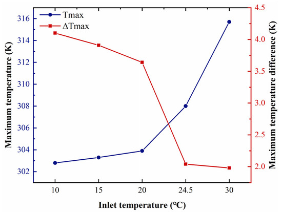(a) Influence of inlet velocity on Tmax. (b) Comparison of ΔTmax at different inlet velocities.