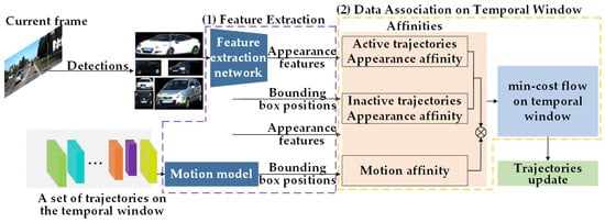 - The trajectories within the temporal window are divided into active trajectories and inactive trajectories. The affinities between each category of trajectories and detections are computed based on appearance and motion features. By constructing a sparse affinity network and solving the min-cost flow problem, the data association is performed, leading to a reduction in ID switches.