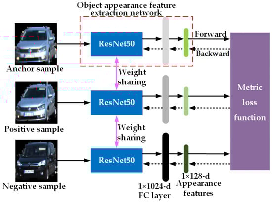 - By leveraging the feature extraction capabilities of CNN and incorporating metric learning, we design a three-channel neural network with ResNet50 as the backbone network and a triplet loss as learning function. The network aims to extract object appearance features that possess high discriminability. Simultaneously, we employ the KF with CA motion model to optimize and predict the bounding box information of objects. As a result, we obtain robust object representation features.