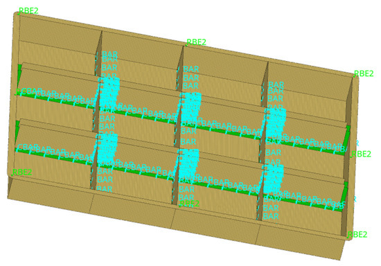 Before analyzing the characteristics of the quick-replacement battery box, it is necessary to optimize grid quality in order to satisfy its requirements in terms of grid size, unit properties, and density. The number of grids has a significant impact on both the accuracy and speed of calculations. Generally, increasing the number of grids leads to improved accuracy, but also results in longer computation times [13]. When setting model properties, stress in the thickness direction can be ignored to facilitate calculation. Therefore, shell units can be effectively used to simulate the box model’s thickness. Ultimately, 77,398 grids and 77,232 nodes were divided, and the divided grids had to be checked and corrected (as shown in Figure 3).