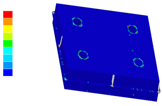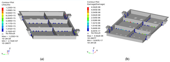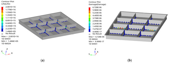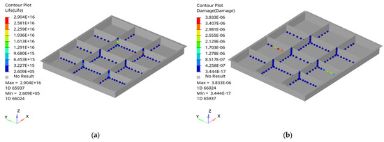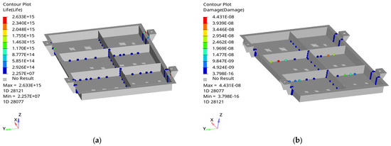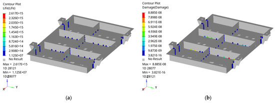 This paper studies the fatigue reliability of the stress concentration in a quick-replacement battery box. Using Rupp’s equivalent structural stress as an example, the structural stress value can be directly calculated by combining the diameter of the welding core and plate thickness, after obtaining various loads on the welding core. This method is suitable for various types of specimens [22]. During the process of fatigue analysis, different fatigue events can be obtained by combining the load spectrum under various working conditions [21], allowing for the simulation of the effect of fatigue analysis on the welding points of the quick-replacement battery box. Finally, a cloud map of the fatigue life of and damage to the quick-replacement battery box and its welding points were obtained, as shown in Figure 9, Figure 10 and Figure 11.