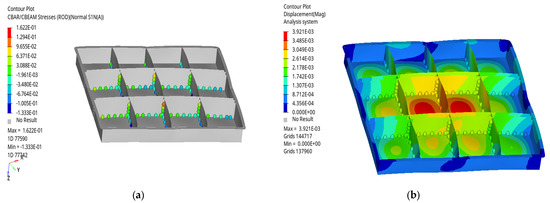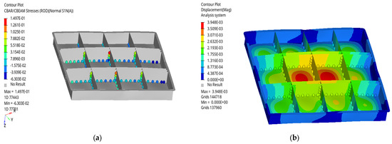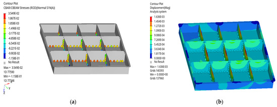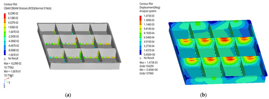 The vehicle load when moving on a bumpy road is mainly represented by an acceleration of 11 g in the Z direction. The stress cloud map of the quick-replacement battery box and welding points is shown in Figure 6a. It can be seen from Figure 6a that the stress is concentrated at the middle bottom of the quick-replacement battery box, while the welding points in the middle partition are under great pressure. The displacement cloud map of the quick-replacement battery box and welding points is shown in Figure 6b. It can be seen from Figure 6b that the middle bottom of the quick-replacement battery box is significantly deformed relative to the partition, but the welding points in the middle partition maintain a stable connection.
