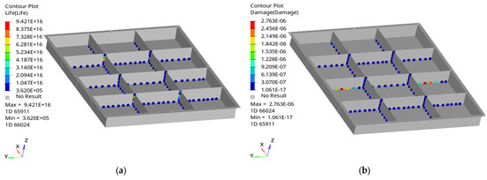 A characteristics analysis of the welding points in the quick-replacement battery box showed that the top junction of the partition board has the largest damage fatigue evaluation value. This indicates that the welding method or structure needs to be optimized. Next, the fatigue tolerance of the optimized quick-replacement battery box will be analyzed to evaluate the battery box’s resistance to fatigue damage and to achieve further optimization. The detailed results of this analysis are shown in Figure 13, Figure 14 and Figure 15.
