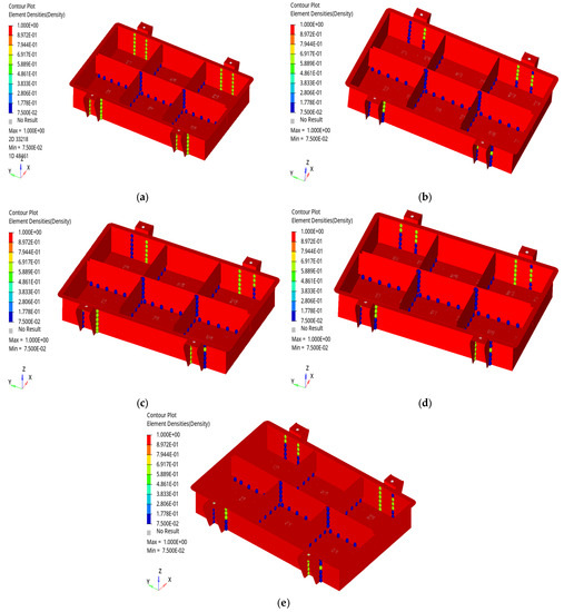 Topological optimization cloud map of welding points of the quick-replacement battery box: (a) sharp braking; (b) sharp turning; (c) bumpy road; (d) sharp braking on a bumpy road; (e) sharp turning on a bumpy road.