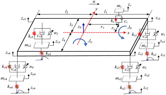 The 8-DOF dynamic model of the full vehicle comprehensively considers the effects of vertical, pitch, and roll motions. To reduce and suppress the vibration and impact caused by uneven road surfaces, the active suspension system is employed. The dynamic features of the vehicle’s suspension are fully represented by the active suspension, which actively controls the vibration that is transmitted to the human body. Based on the above analysis, the simplified physical model is shown in