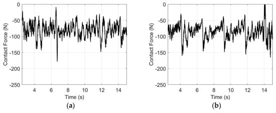 The rail vehicle is assumed to operate at a forward velocity of 80 km/h with fundamental torque from the traction motor on the tangent track. An uplift force of 1650.69 N is applied to the pantograph mechanism. The numerical results in Figure 6 verify that the model’s parameters are suitable for the EN 50318 standards. In the case of the dynamic behavior analysis, due to the steady crosswind effect on the tangent track, the steady crosswind direction is horizontal and perpendicular to the tangent track. Figure 7 displays the contact force history over time as the rail vehicle moves through the steady crosswind. The contact force of each case is analyzed in the mean contact force and standard deviation (SD) of the contact force, as concluded in Table 2. The mean contact force, SD of the contact force, mean NWR from mechanical (MNWR) and electrical contributions (ENWR), total mean NWR (TNWR), and percentage of contact loss are analyzed in Table 2 to examine the wear behavior of the pantograph–catenary system. The steady crosswind direction is horizontal and perpendicular to the tangent track. Numerical results show that the mean contact force increases with an increase in the steady crosswind velocity because of the aerodynamic lift force on the pantograph–catenary system, which reduces the percentage of contact loss, and the mean NWR from the mechanical contribution also increases. With the increase in the steady crosswind, the trend of the mean NWR from the mechanical and electrical contributions is similar to that of the mean contact force and SD of the contact force, respectively. The increase in the SD is not related to the percentage of contact loss because of the increase in the mean contact force. These results indicate an advantage of pantograph–catenary aerodynamic design, in which the steady crosswind causes a lift force on the pantograph and a downforce on the catenary. Interestingly, the total NWR slightly decreases because the decreasing value of the mean NWR from the electrical contribution is more than the increasing value of the mean NWR from the mechanical contribution. To increase the NWR effect from the mechanical contribution, the uplift force on the pantograph mechanism in the simulation increases from 1650.69 to 1815.69 N. The mean NWR is shown in Table 3. The trends of the mean contact force, SD of the contact force, and mean NWR from the mechanical and electrical contributions with the increase in steady crosswind velocity and uplift force are the same. However, the mean total NWR increases because the decreasing value of the mean NWR from the electrical contribution is less than the increasing value of the mean NWR from the mechanical contribution. Therefore, the numerical results, which follow the EN 50318 standards and the aerodynamic design of the pantograph–catenary system, show the advantage for wear behavior on the catenary when the vehicle moves through 10 m/s of steady crosswind, and the mean of the total NWR is approximately the same.