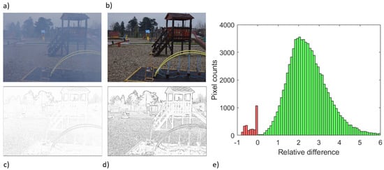 Gradient comparison between a fogged image (a–c) and its fog-free ground truth (b–d). Both color images are presented on top with their associated edge images below. (e) Histogram of the relative difference between images (c,d).