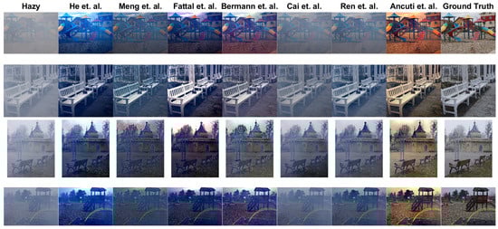 To validate our proposed metric, we tested it on the O-Haze dataset []. This dataset was used in the NTIRE 2018 challenge []. It consists of 45 outdoor scenes. Each fogged scene has its ground truth counterpart. Apart from that, the results of seven defogging methods provided by seven research groups were also facilitated with the dataset. Figure 3 shows some examples of the O-Haze dataset as well as the seven mentioned results of the defogging methods. We used our metrics to compare the results of some groups who participated in the challenge. During the NTIRE’18 defogging challenge, the groups received 35 fogged images with their respective ground truth for training their networks. They also received five more images for validation purposes and five more for testing; these images were evaluated by the jury. Again, the last 10 images had their respective ground truths delivered. To fully validate the effectiveness of our metrics, we used the abovementioned 45 scenes with every defogging method available, reaching up to 405 images. Apart from that, we also tested two state-of-the-art defogging evaluation metrics, FRFSIM [], an FR-IQA metrics based on statistical behavior over human judgment on foggy scenes, and FADE [], an NR-IQA fog density prediction model based on natural scene statistics, on the O-Haze dataset and compared the results with our own.