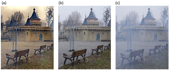 Nowadays, there are several approaches that can be used to defog an image. Firstly, active approaches rely on using gated images [] or polarized light [,] to obtain more information about the scene. Gated imaging usually requires expensive electronics, and polarimetric imaging is challenging to implement in outdoor systems, which is the main target of defogging. Polarimetric images are also complex to automatize and implement in autonomous systems because they usually require an estimation of the physical parameters of the scene [].