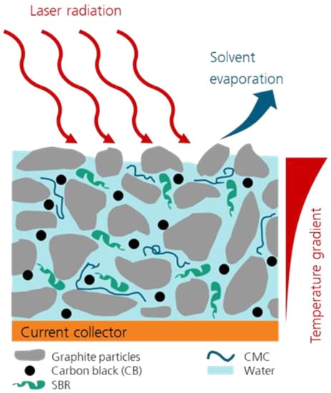 Figure 1. The laser radiation is transformed into thermal energy when it is absorbed by the components of the wet slurry. With a high-volume fraction and a high absorbance, graphite particles, as well as conductive carbon, are mainly responsible for the absorption of the laser radiation by the anode slurry. The increase in temperature leads to the evaporation of the volatile solvent, in this case water, until the anode is dry. During this process, the water content, as well as the thickness of the coating, decreases. The drying process can be divided into several steps, which have been described in detail by several authors [