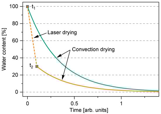 This combined process results in two separate drying regimes. The first section is defined by the laser parameters and the air flow. The second section, in which the remaining water is removed in the moisture analyzer (convection drying process), is defined by the drying temperature and the water vapor removal from the drying chamber, which is realized with an integrated fan. The resulting heating rates in the laser drying step might deviate drastically from the second drying step, where a constant temperature in the moisture analyzer is applied to remove the remaining water. The expected drying rates and water content are schematically depicted in