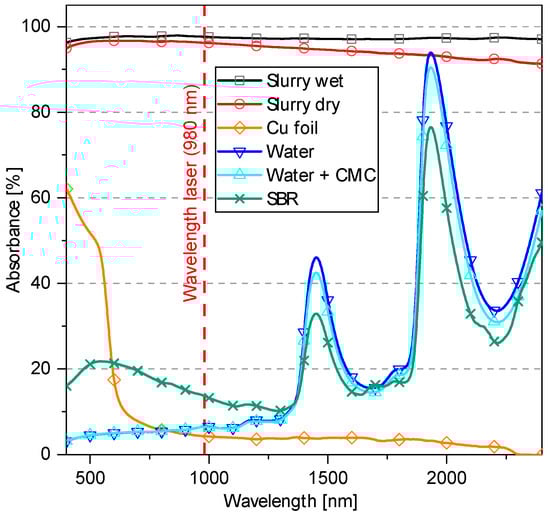 The optical properties of the slurry components are analyzed in a spectrometer (UV-VIS-NIR spectrometer, Perkin Elmer, Waltham, MA, USA) for wavelengths between 350 and 2400 nm. An integrating sphere is used to ensure that scattered light is also collected and measured. The wet slurry components are placed between two microscopic slides that are set apart 140 µm with spacers. The reflection losses at the interfaces are considered and are removed from the absorption spectra accordingly. The transmittance T and reflectance R are measured, and the absorbance A is then calculated (A = 100 − T − R). For the copper foil and the dried anode on copper foil, only the reflectance is measured, as the transmittance equals zero. As only wet mixtures or dry electrodes can be measured, components like pure graphite, carbon black and solid CMC are not included in the measurement.