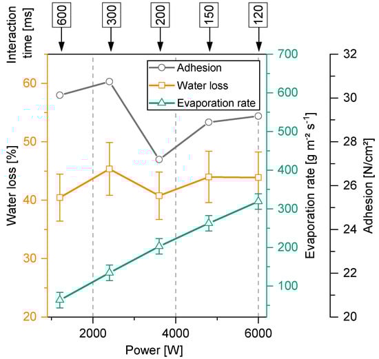 Figure 3. From the weight difference between the points t1 and t2, the average drying rate in the laser drying step can be calculated. From the interaction time, the power, and the weight loss, the evaporation rate at a specific energy input is calculated. Due to the high intensities that can be reached in the laser drying process, the water content can be reduced at a higher rate than in a conventional convection drying process. The remaining water is then removed in a subsequent drying step. With this combination, low water contents can be achieved faster than in a convection drying process only. This approach raises the question of whether the partial fast laser drying step affects the properties (like adhesion reduction due to binder migration) of the electrode in an undesired way. Despite the combination of laser drying and convection drying, the samples will be labeled as “laser dried” hereafter.