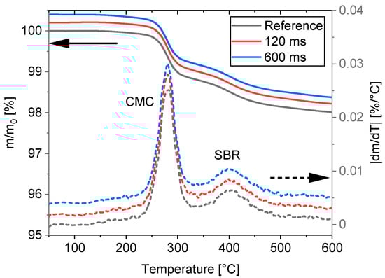 TGA is carried out in a TGA Q5000 (TA Instruments, New Castle, DE, USA). The thermal stability of the samples was analyzed up to 600 °C for the laser-dried anodes. The TGA measurements are performed at a linear temperature ramp of 10 K min−1 under nitrogen gas flow. The measured parameter is the mass loss (weight) depending on the temperature.