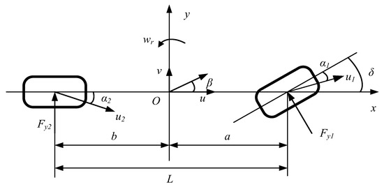 where m (kg) is the mass of the vehicle; (rad/s) is the yaw rate of the vehicle; I (kg·m2) is the vehicle yaw moment of inertia; is the longitudinal speed; is the lateral speed.