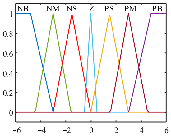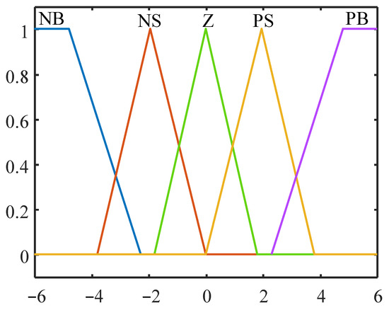 The fuzzy subset elements corresponding to the input variables are NB, NS, Z, PS and PB. The basic domain of the input variables is set to [−6, 6]. In order to ensure accurate and stable control, the fuzzy subset elements corresponding to the output variable are NB, NM, NS, Z, PS, PM and PB, and the domain of the output variable is set to [−6, 6].