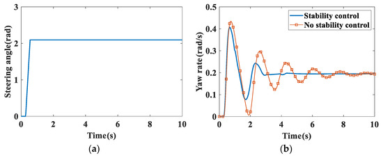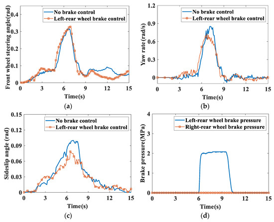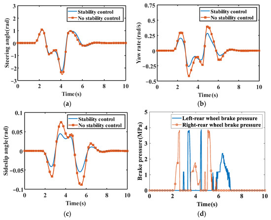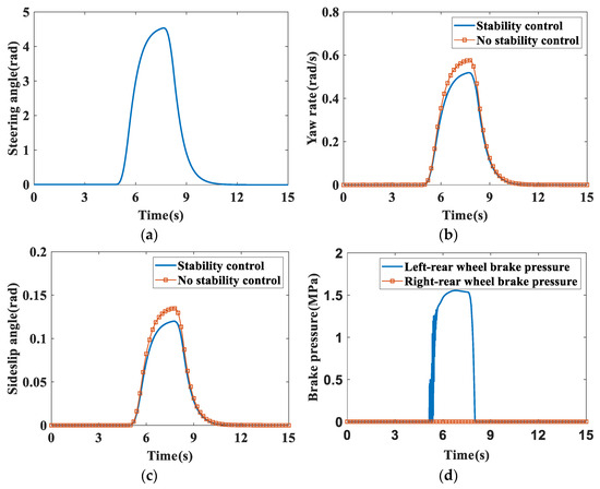 - Referring to the ISO3888-1:2018 standard, the initial speed is set to 120 km/h in CarSim and the road adhesion coefficient is 0.8. The steering angle is shown in Figure 10a. It can be seen from Figure 10b,c that the maximum yaw rate and sideslip angle reach 0.405 rad/s and 0.075 rad without the participation of stability control, respectively, while in the case of stability control, the yaw rate and sideslip angle are 0.281 rad/s and 0.044 rad, down 0.124 rad/s and 0.031 rad, respectively. In a word, there is a better improvement than without the participation of stability control. Figure 10d shows the braking pressure of the wheel with stability control.