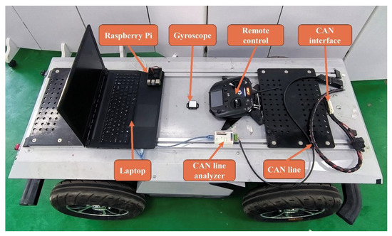 The required data for the test include the front wheel angle, vehicle speed, yaw rate, lateral acceleration, braking pressure and more. The wire-controlled mobile platform is equipped with a CAN interface, so we can use the CAN interface for vehicle information acquisition. This method to obtain data mainly uses the CAN interface, CAN line, CAN line analyzer, raspberry Pi 4 Model B and laptop. The yaw rate and lateral acceleration can be measured by gyroscope sensors. The gyroscope selected in this test is the BWT901CL-TTL gyroscope sensor (Wit, shenzhen, China) from Shenzhen Wit Intelligent Technology, and its specific parameters are shown in Table 6.