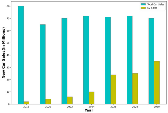 The potential features of EVs welcome governments to undertake heavy investments in EV adoption. EVs are currently viewed as key pillars for economic development. The current automobile market is highly focused on EVs and Plug-In-EVs (PEVs). A study by Canalys shows that EV sales have boomed up in 2020, and by 2030, EVs will represent almost 50% of total cars, globally, as illustrated in Figure 2 [17].